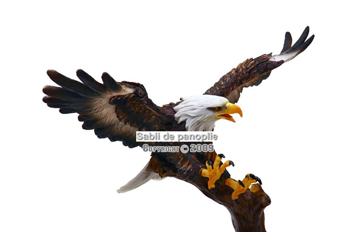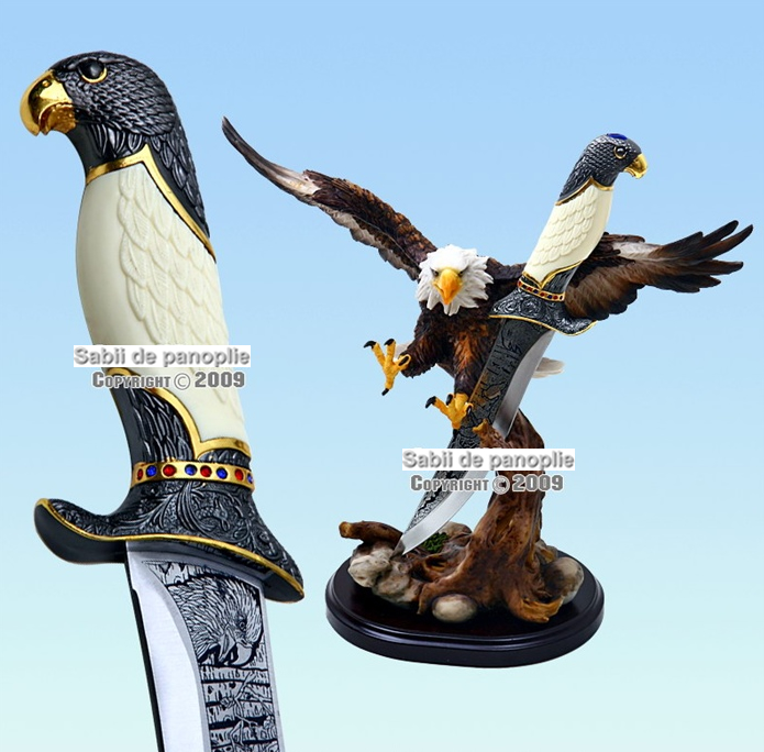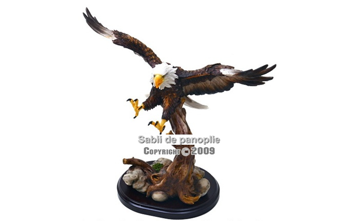 Statuia surprinde maiestuosul vultur plesuv pregatindu-se de aterizare. Baza statuii este facuta din lemn pictat cu visiniu. Deschiderea aripilor sale masoara 36 cm. Lungimea acestuia de la cioc la coada este de 18 cm. Inaltimea acestuia este de 21 cm, masurata de la baza. Statuia vine cu un pumnal cu un cap de vultur in capat, acesta poate fi folosit si ca deschizator de scrisori. Manerul cutitului este bogat ornat cu bijuterii inglobate.