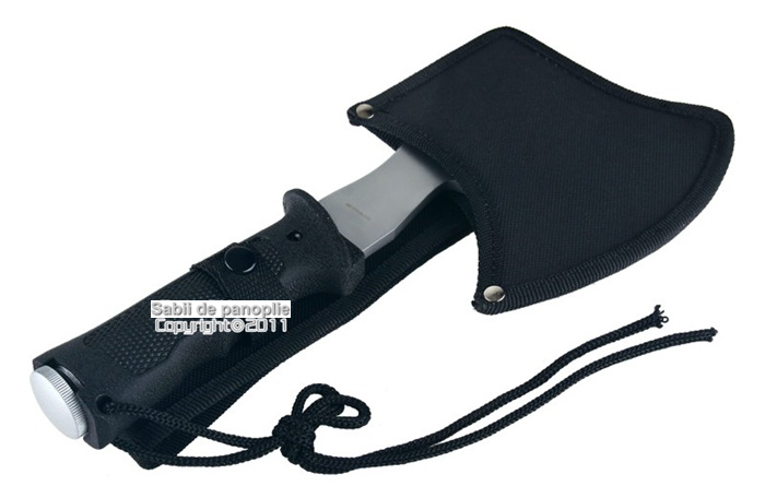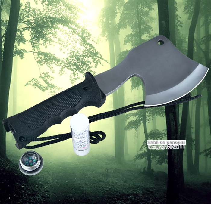 - Lama toporului este argintie, grea si construita din otel inoxidabil 440.